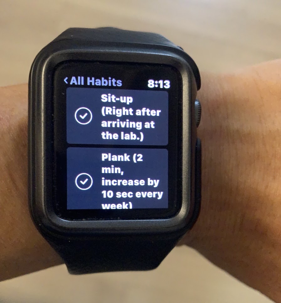 그리고, 하루 중에 하나하나의 습관을 완수할 때마다, 착용 중인 애플 워치의 컴플리케이션을 선택해서 완수했다고 체크하고 있다. 물론, 시계 페이스 하단에는 그날의 남아 있는 습관 항목 잔여 개수가 표시돼 있기에 자연스레 나를 촉진시켜 준다.