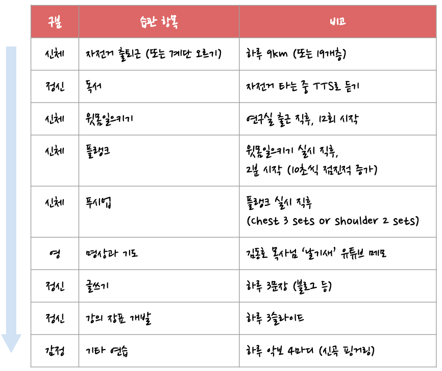 이렇게 해야 할 습관 항목을 명확히 구체적으로 설정해 두고, 행동을 해야 하는 상황(때, 장소)과 순서까지 지정해 두니 아침에 출근해서 연구실에 도착한 얼마 되지 않는 짧은 시간 동안 그날 그날 하려고 계획했던 습관 행동 5개를 금새 후딱 해 치우게 됐다.