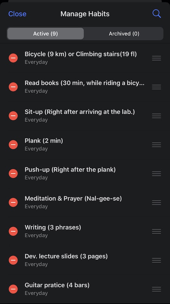 내가 Habitity 앱의 습관 리스트에 등록해 놓은 항목 갯수는 9개다(아래 내용). 습관 항목을 영어로 표현했는데, 적절한 영어 표현을 연습하기 위한 목적 차원이지 한글이 지원되지 않기 때문은 아니다. 한글 입력에 전혀 문제 없다.