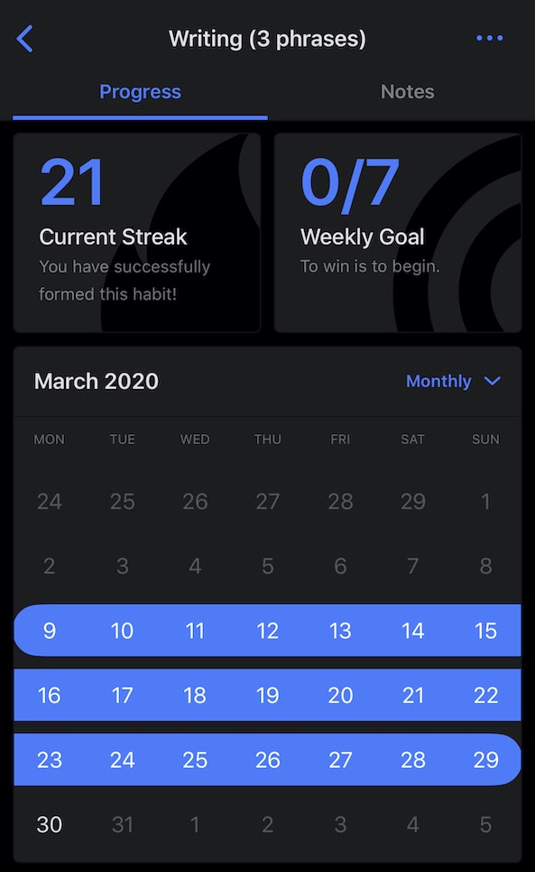위의 사진은 Habitify에 기록돼 있는 글쓰기 수행 결과이다. 지난 3주 동안 단 하루도 빼 먹지 않고 글쓰기를 했다. 일이 바쁘고 몰린 날에도 조금이라도 글을 쓰고 있다.