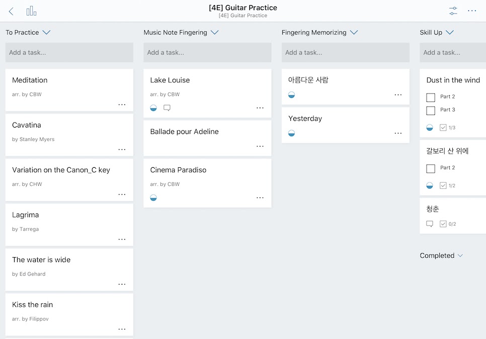 기타 연습의 만족감을 높이기 위한 방법으로, ‘습관 추적'의 방법도 적용하고 있다. MS Planner라는 도구를 이용하여 기타 연주곡 연습의 단계를 4단계로 나누어서 관리하고 있다.